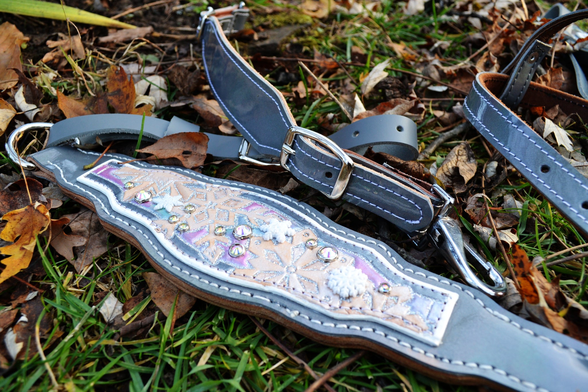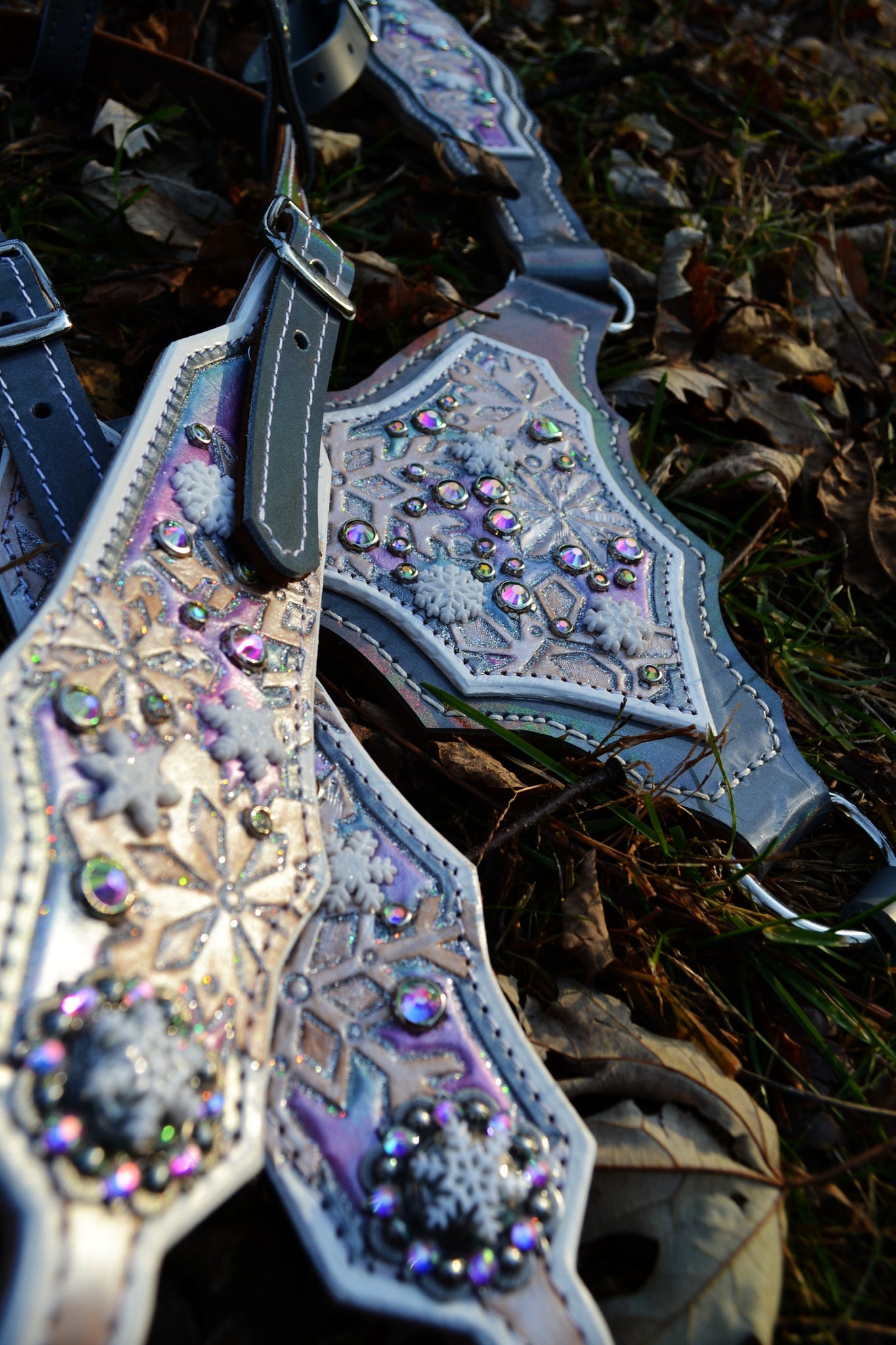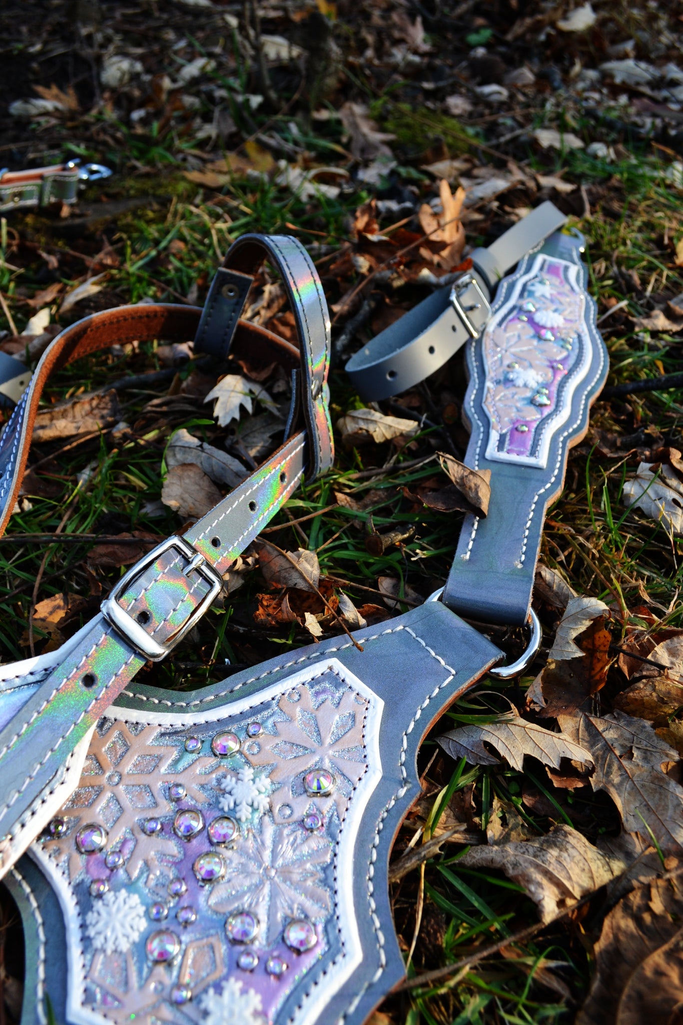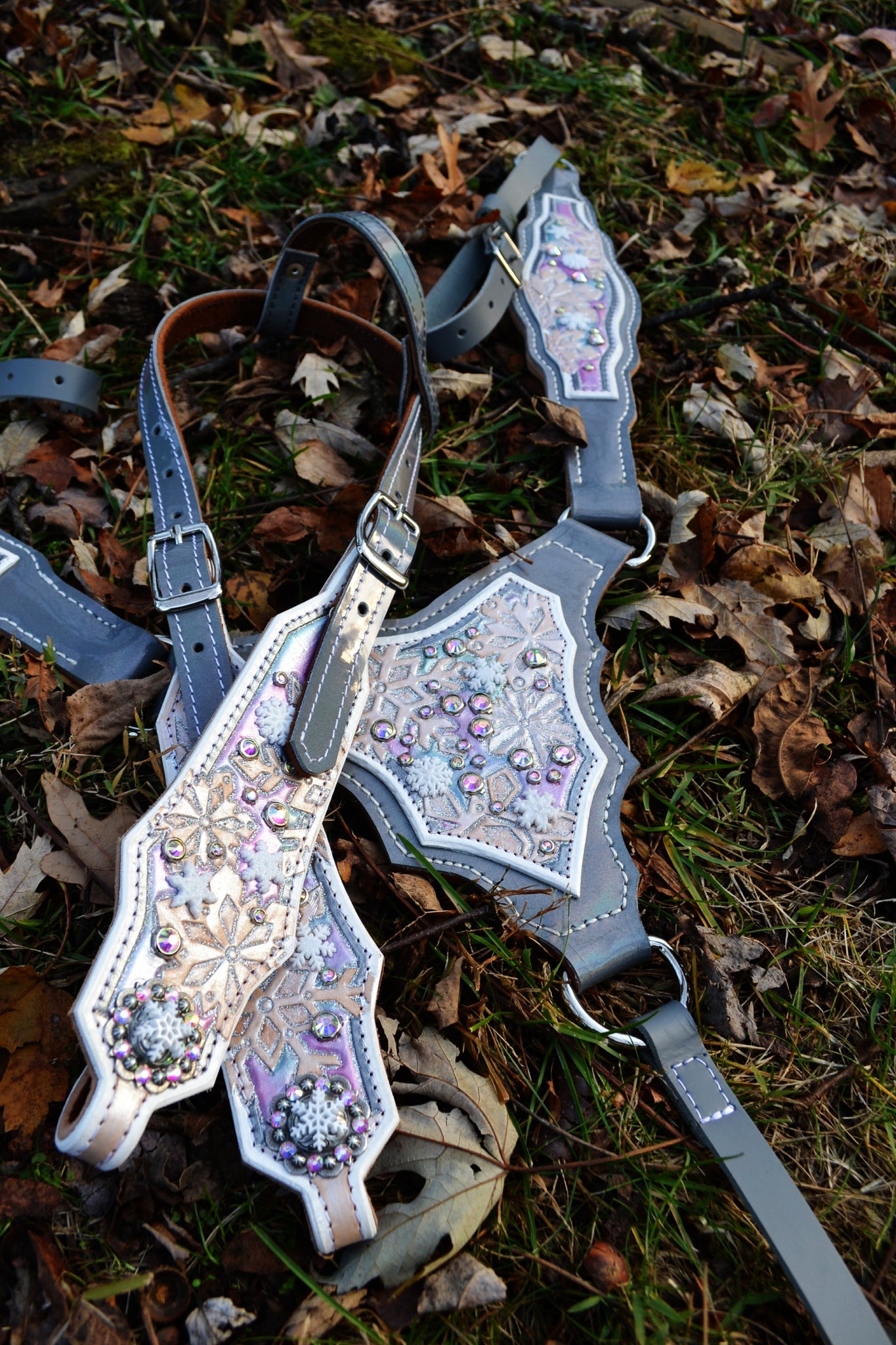 Step into a world of twirling snowflakes with this magical tack set, featuring a gladiator-style breast collar, one-ear headstall, and matching wither strap—each piece designed to feel as if it danced right out of a frosted fairy tale.