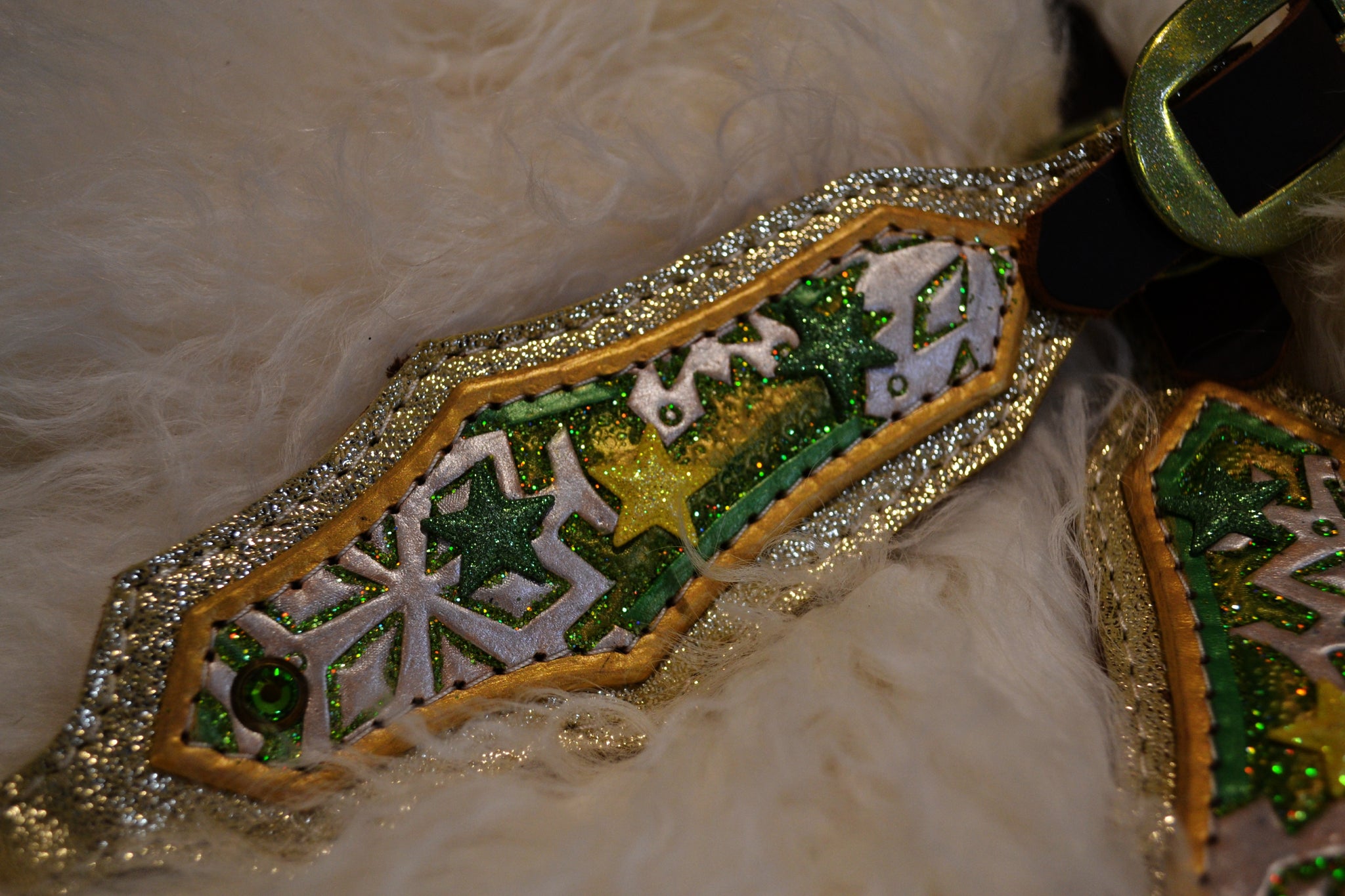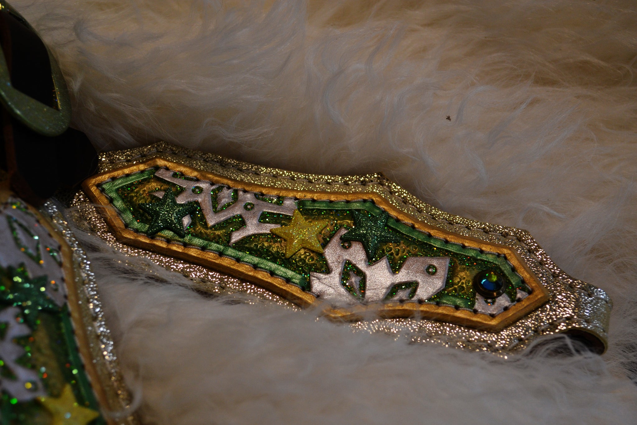 Hand-tooled snowflakes dance across a glitter-antiqued base, framed by sparkling star cabochons and rhinestones that catch the light with every movement. Set against a dark brown leather crown strap and finished with green glitter buckles, this piece feels both regal and otherworldly.