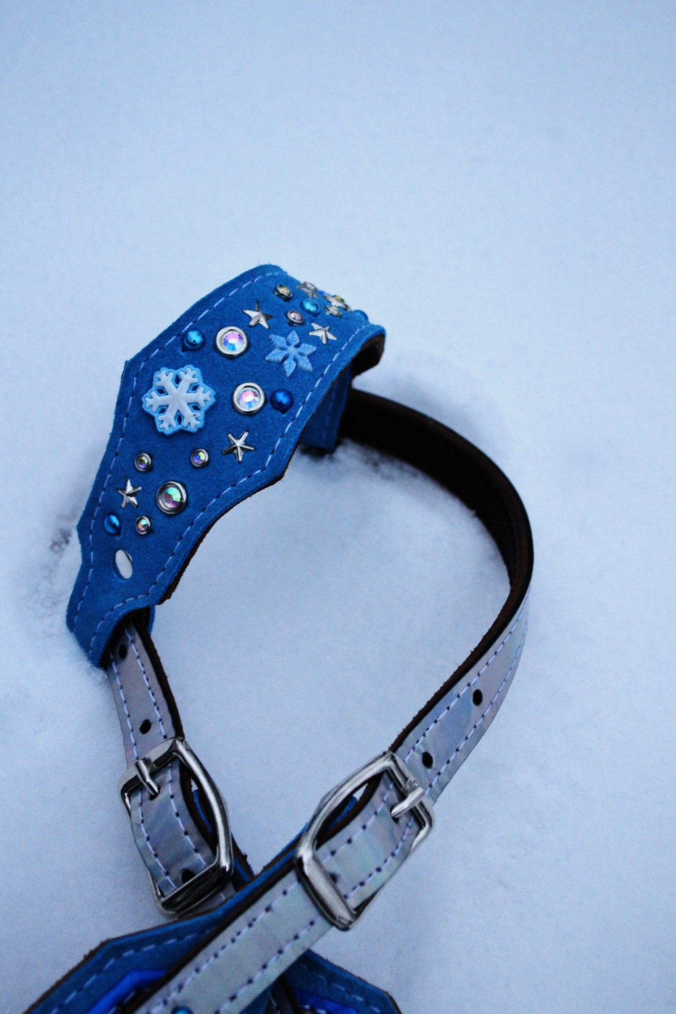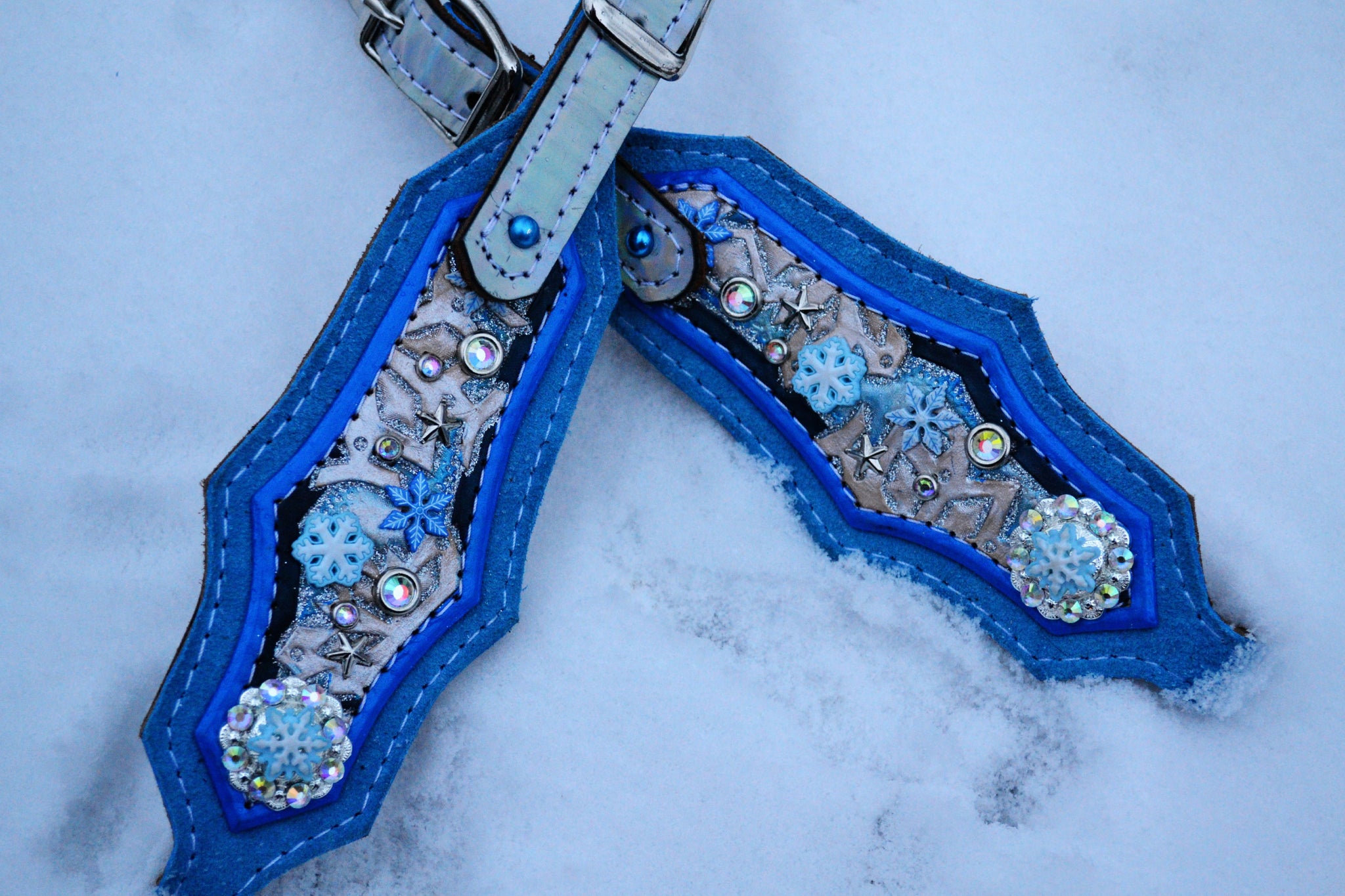 Crafted with layered blues, holographic accents, and custom snowflake details, this piece is perfect for riders who love bold tack with a touch of magic.